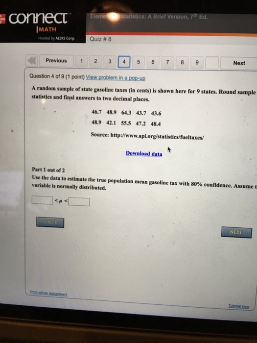 . A random sample of state gasoline taxes in cents is shown here for 10 states. State Gasoline Taxes A random sample of state gasoline taxes in cents is shown here for 10 states. 02 Part 1 of 2 Use the data to estimate the true population mean gasoline tax with 90 confidence.