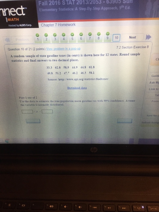 A random sample of state gasoline taxes in cents is shown here for 12 states. 02 Part 1 of 2 Use the data to estimate the true population mean gasoline tax with 95 confidence. A random sample of state gasoline taxes in cents is shown here for 12 states.
